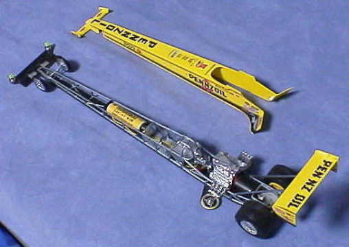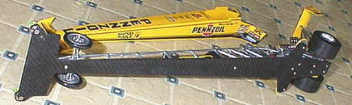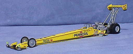 | AMTだかのドラッグスターのプラモデルを利用して、モーターライズ化しました。一応ローラーも付いてますので、ミニ四駆のコースも走らせられます。ストレートコースで走らせると、なかなか雰囲気のある走り方で結構速いです。 |
