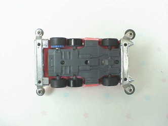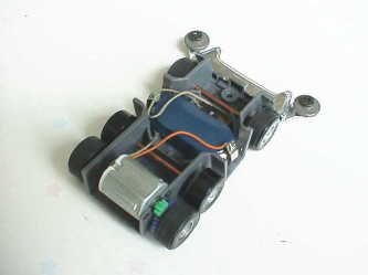 モーターはジャンク屋で入手したミニモーターで、ピニオンはミニ四駆のプロペラシャフトの物を使い、スパーはやはりミニ四駆のノーマルカウンターギヤを加工して使いました。前2輪駆動です。 真ん中辺に見える紺色の物は小型の2.4Vニッカド電池で、その向こう側に下側から操作できるスイッチが付いています。 |