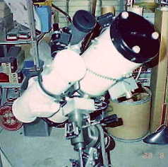 1987年頃に製作した、ニュートン式とカセグレン式を簡単に切り替えられる望遠鏡です。自作というよりも市販望遠鏡の改造ですね。 この望遠鏡は池袋のサンシャインで行われた望遠鏡ショーのジャンク市で知り合いが入手し、その後私が譲り受けたケンコーの15Cmダルカーカム(試作品?)が元になってます。 |
