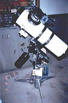 アストロのメガ赤道儀に載せたところ。この赤道儀は、純正のモーターが100Vのシンクロナスモーター(^^;で、値段も5万円くらいするので、ビクセンのMD−6を改造して取り付けました。 ピラー足は短く切断してあります。 これに自作の10Cmニュートンのガイド鏡を同架して撮影していました。 接眼部の反対側にぶら下がっている箱はカメラのシャッターを電動で機械式に開閉する装置です。 残念ながら現存するのは主鏡筒と赤道儀だけで、ガイド鏡やファインダーは養子に行ってしまいました。(;;)/~ |