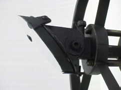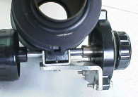 | スパイダーリングを90度まわしたところ。上側に見えるのがニュートン斜鏡です。 | こうやって手で回してやります。止めネジは先がテーパーになったネジで、スパイダーリング外側の穴に刺すような感じでねじ込み、固定します。 | ||