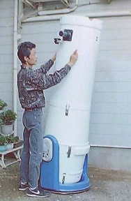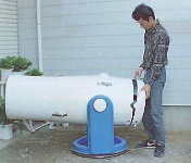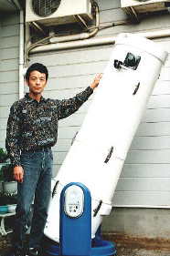 1995年に完成したFRP製ドブソニアンです。これはスカイウオッチャー誌に掲載されたので、ご存じの方も多いと思います。87年にアメリカのクールター社に鏡を発注して手元に届いたのが89年、完成までにそれから実に6年も掛かってしまいました(^^;。 一番の問題だったのがチューブ鏡筒と収納性の両立で、さらには、高価な光学系を長持ちさせるために保管時のことも考慮する必要がありました。 最終的には鏡筒を4分割にし、それぞれを重ね合わせることで2つのユニットにし、片方のユニットに光学系を集めることで、保管時の管理もし易くすることが出来ました。 架台ユニットは車に積みっぱなしで、光学系ユニットだけ乾燥剤を入れて室内に保管しています。 なお、お察しの通り、この望遠鏡で得たノウハウはNinja−400に生かされています。 |