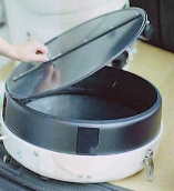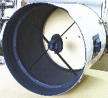 ◆主鏡セル 9ポイント支持で、鏡周をバンドで吊るタイプのセルです。詳細はこちら。裏側中央にはペンチレーションの為のルーバーが付いていて、ここにファンを取り付けて外気を送り込み、強制冷却します。ルーバー内には埃が入らないようにフィルターを付けてあります。 セル部には蓋が付いていて、すべて組み上げた後に耳軸部の鏡筒に付いた窓から手を突っ込んで開けるようになってます。蓋は薄いFRPで出来ていて、鏡筒内面のRに沿うように開きます。 |
