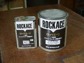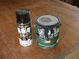 左側が関西ペイント(カンペ)のエアゾールタイプで、右側が大同塗料の刷毛塗り用。緑色の物もあるので、注意してください。こういうのは内容物が沈殿していますので、使用前によ〜く攪拌することが大切です。 |