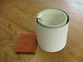右側の白いものが空研ぎ用のペーパーです。酸化アルミの粒を使ったもので、目詰まりもなく、非常によく切れます。各社から出ていますが、3Mのエクセルペーパーなどが有名です。他社でも表面に波目の模様があるタイプなら、同じ様な感じで使えるようです。300#〜400#位のものを使います。 左側に見えるのはスコッチブライトと呼ばれるもので、食器洗いのスポンジの裏側についているものと同じものです。アルミや真鍮では、これでこすって表面を荒らすだけでも大丈夫です。 |